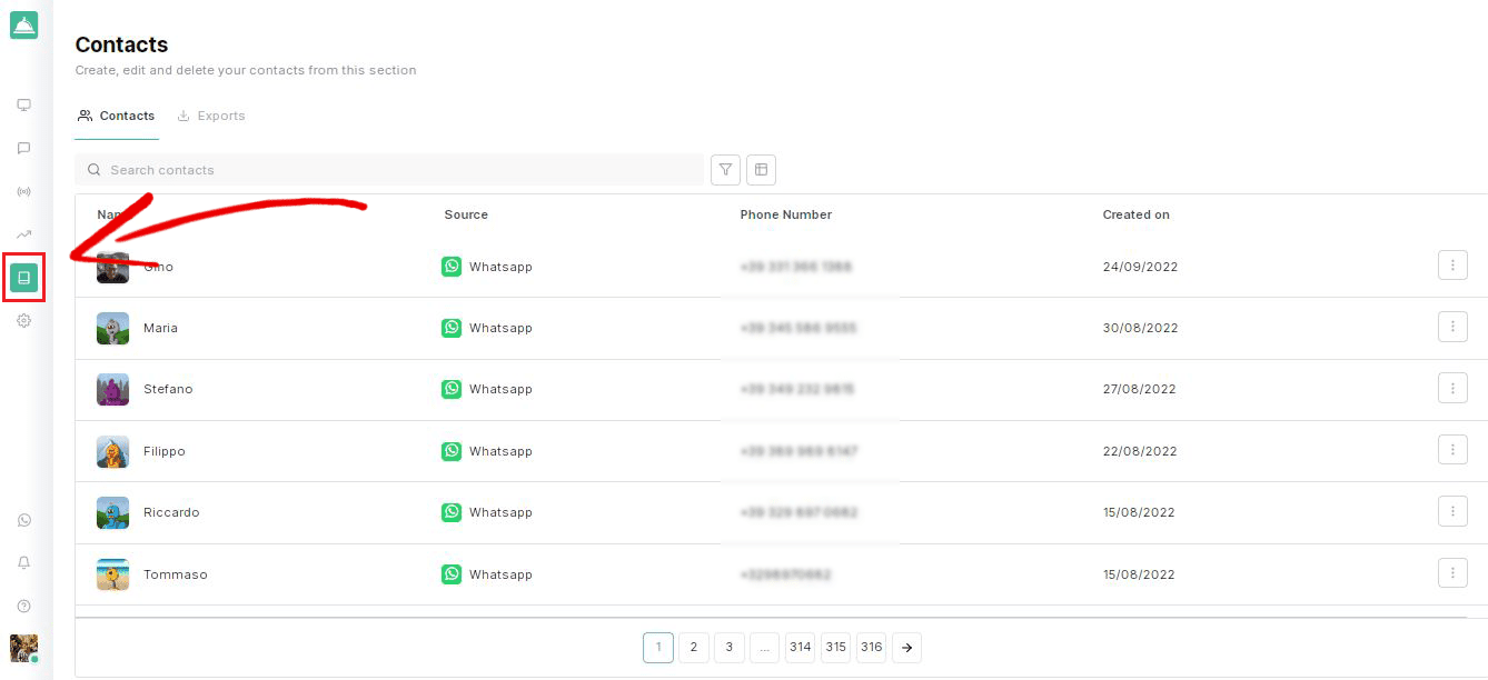Pour tirer le meilleur parti de WhatsApp multi-agents pour votre équipe de vente ou de support, vous pouvez utiliser Callbell comme un CRM. Il suffit d’entrer dans le tableau de bord et, en cliquant sur l’icône Contacts à gauche de l’écran (voir capture d’écran), vous aurez le module Contacts à disposition.