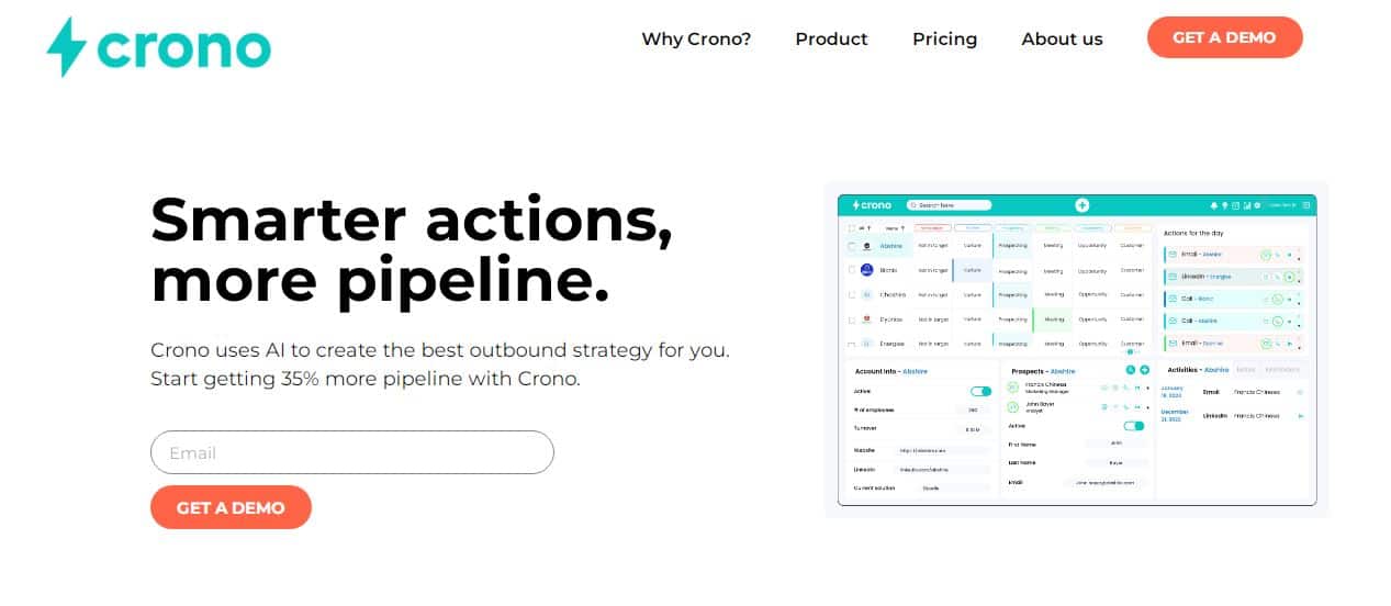 Crono.one è un ottimo tool per outbound dedicato a Sales Reps, SDR e BDR, progettato per rendere semplice, veloce e soprattutto efficace l’outbound prospecting.Integrando algoritmi AI, le azioni consigliate dal tool non sono statiche e identiche per tutti i prospect, ma vengono cambiate dinamicamente in base al contesto in cui il prospetto di trova si trova. Crono offre una dashboard di analisi integrata che aiuta i Sales Reps a gestire i propri flussi di lavoro, nonché informazioni utili per aiutarli a prendere decisioni basate sui dati.